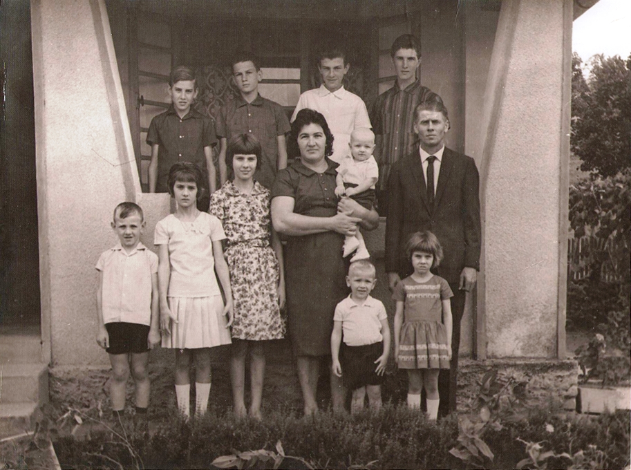 Paulo Dalfovo. la moglie Marcelina e i 10 figli. Foto scattata a Ascurra, intorno al 1967.